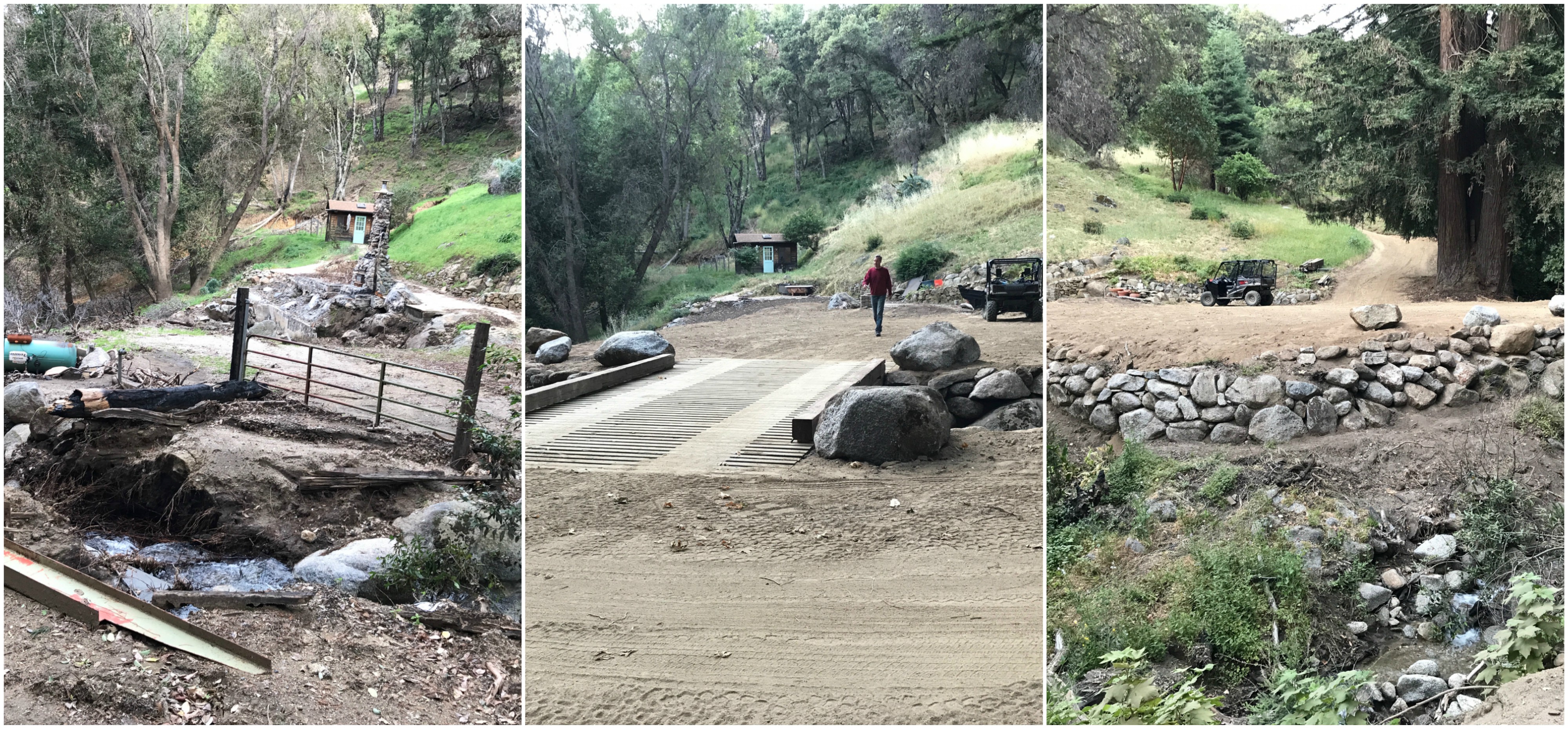 Left: bridge washout in January. Center: new bridge. Right: view from the road as you approach the bridge and future site of the Peace Garden.