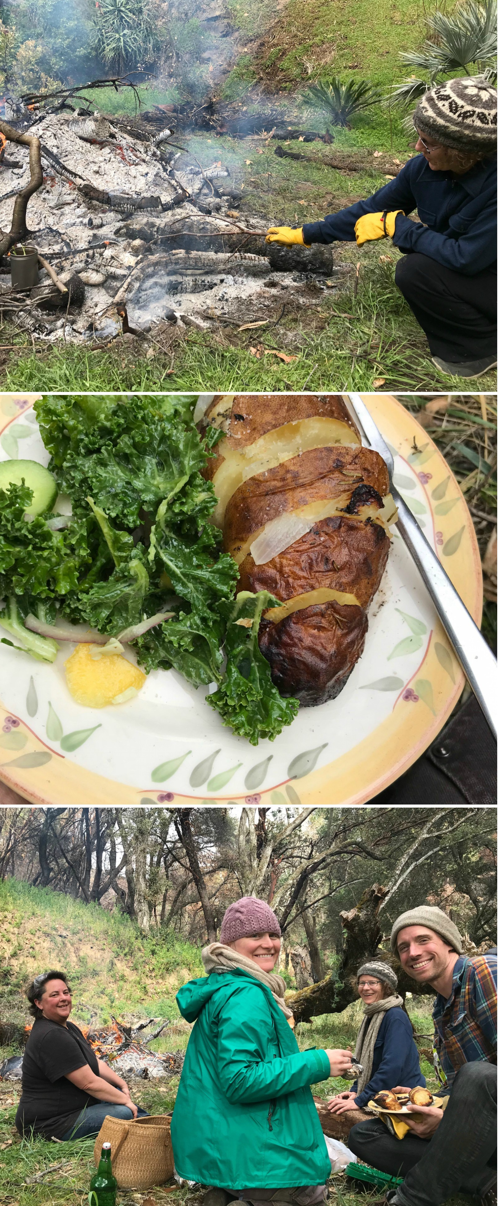 Top: Anne Marie cooks potatoes in the fire. Middle: Yum! Bottom: taking a break from cutting and burning to enjoy a picnic by the brush fire.