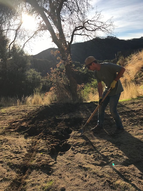 Karma Yogi Eliot digging a diversion swale and berm to divert rainwater.