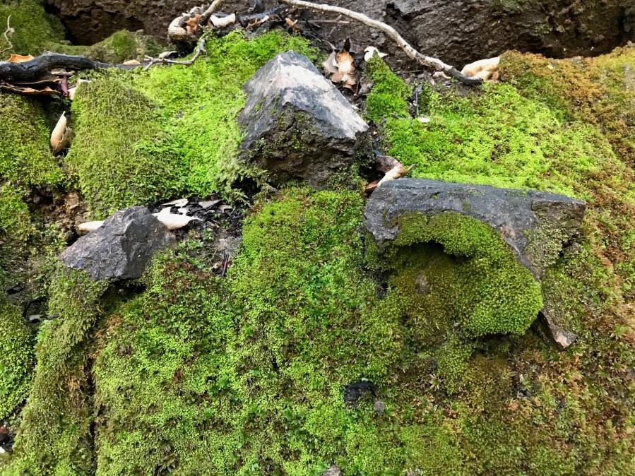 A blanket of moss weaves a tapestry across the uphill slope along our path.