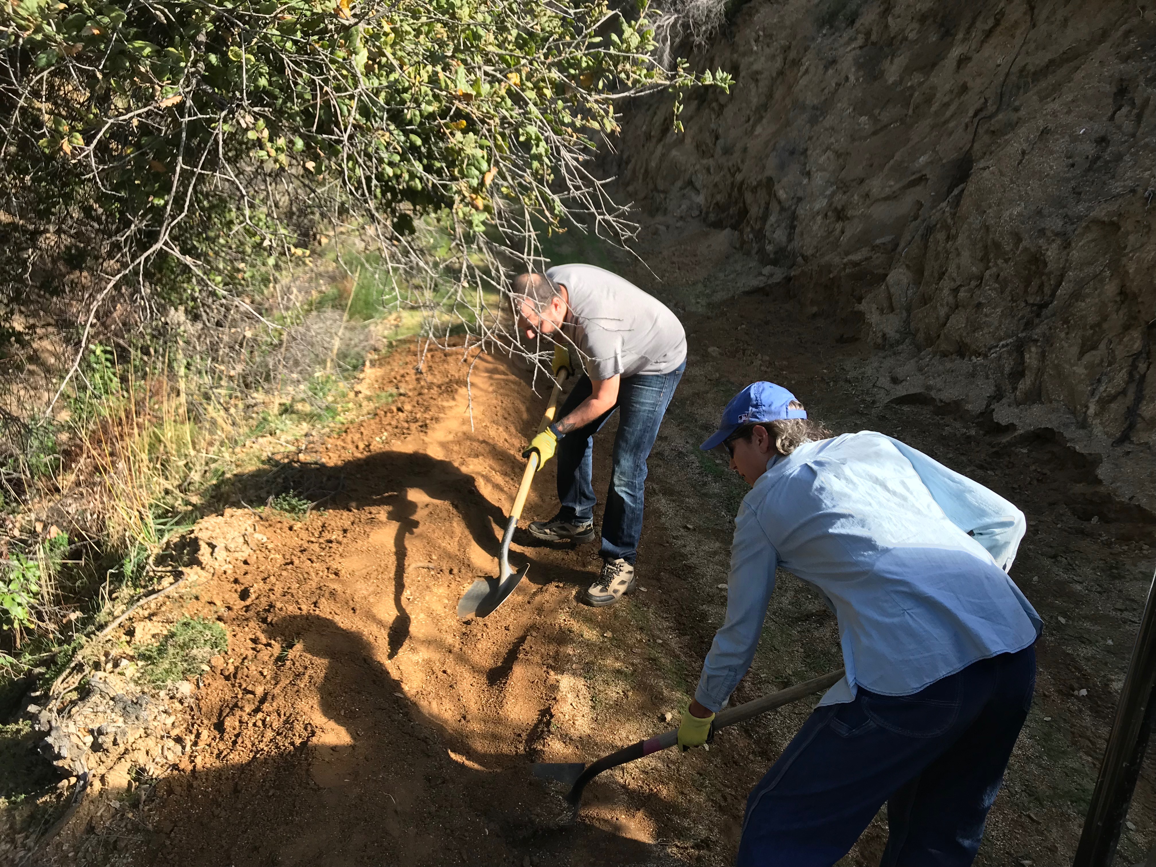 Michael and Kay build a berm to divert rainwater.