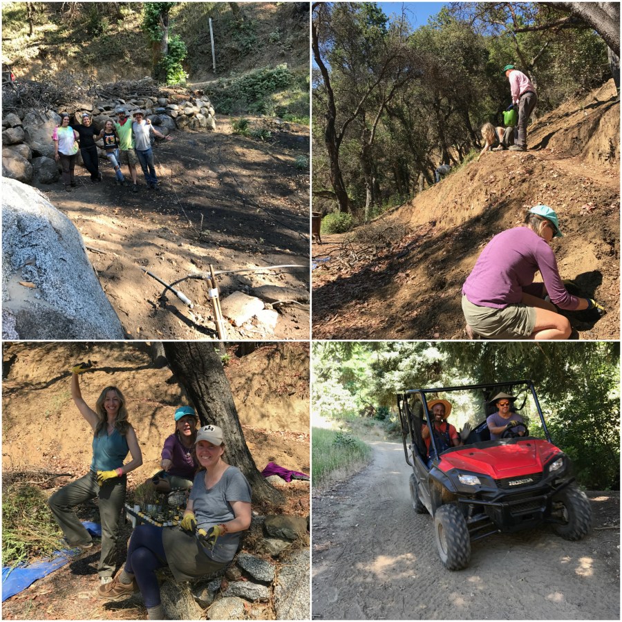 Top left: Jackie, Mila, Jordan, Nick, & Cory celebrating a hard days work. Top right: Cory, Bing, Jillian, and Louise. Lower left: Lara, Lousie & Jillian gently coax the young plants from their pots. Lower right: Brit & Jon back from hauling a load of brush to the burn pile.