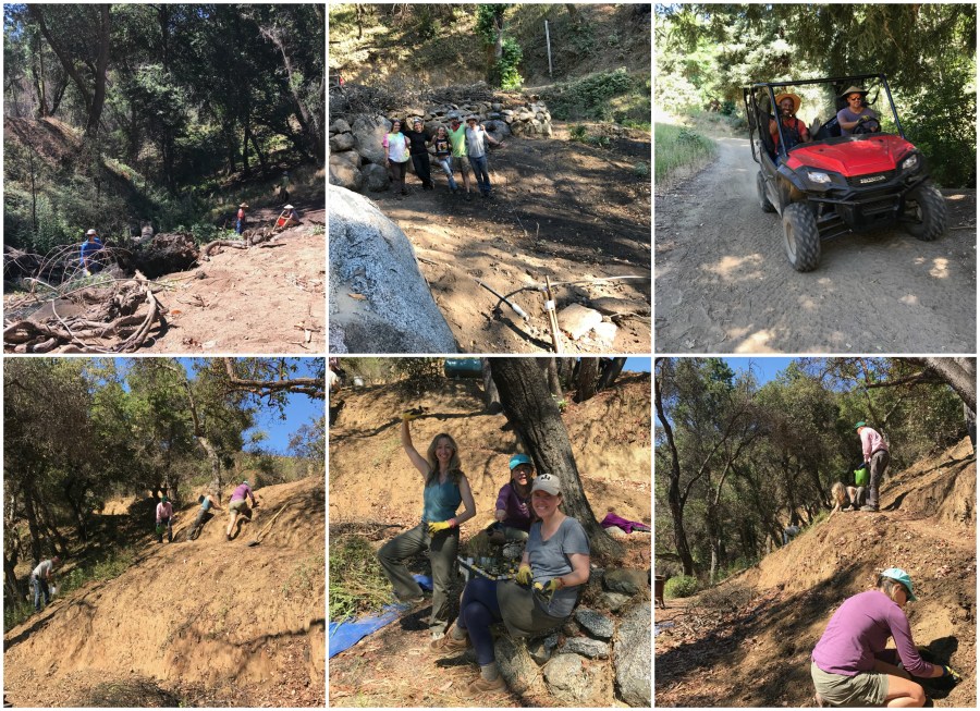 Top left: karma yogis hard at work restoring the riparian corridor at the future site of the peace garden. Top middle: Jackie, Mila, Jordan, Nick, & Cory celebrating a hard days work. Top right: Brit & Jon back from hauling a load of brush to the burn pile. Lower left: karma yogis hard at work planting for erosion control on the trail to Shunyata (yurt). Lower middle: Lara, Lousie & Jillian gently coax the young plants from their pots. Lower right: Cory, Bing, Jillian, and Louise.